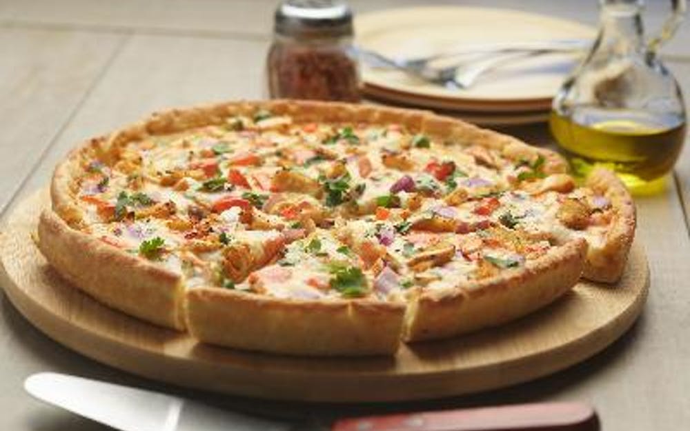 This pizza has our signature butter sauce, our signature All-Natural Butter Chicken Breast, fresh mozzarella cheese, crisp red onions, juicy tomatoes, fresh diced; garlic, ginger, and green chilies, garnished with fresh cilantro.div>