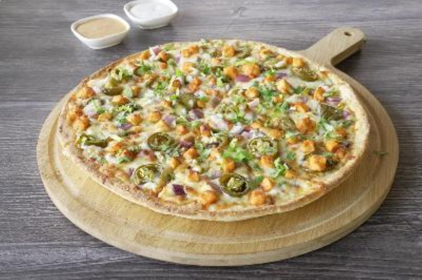 This pizza has our signature garlic sauce, All-Natural Achari Chicken Breast, fresh diced mozzarella cheese, crisp red onions, spicy jalapenos, fresh diced; garlic, ginger, and green chilies, garnished with fresh cilantro and green onions