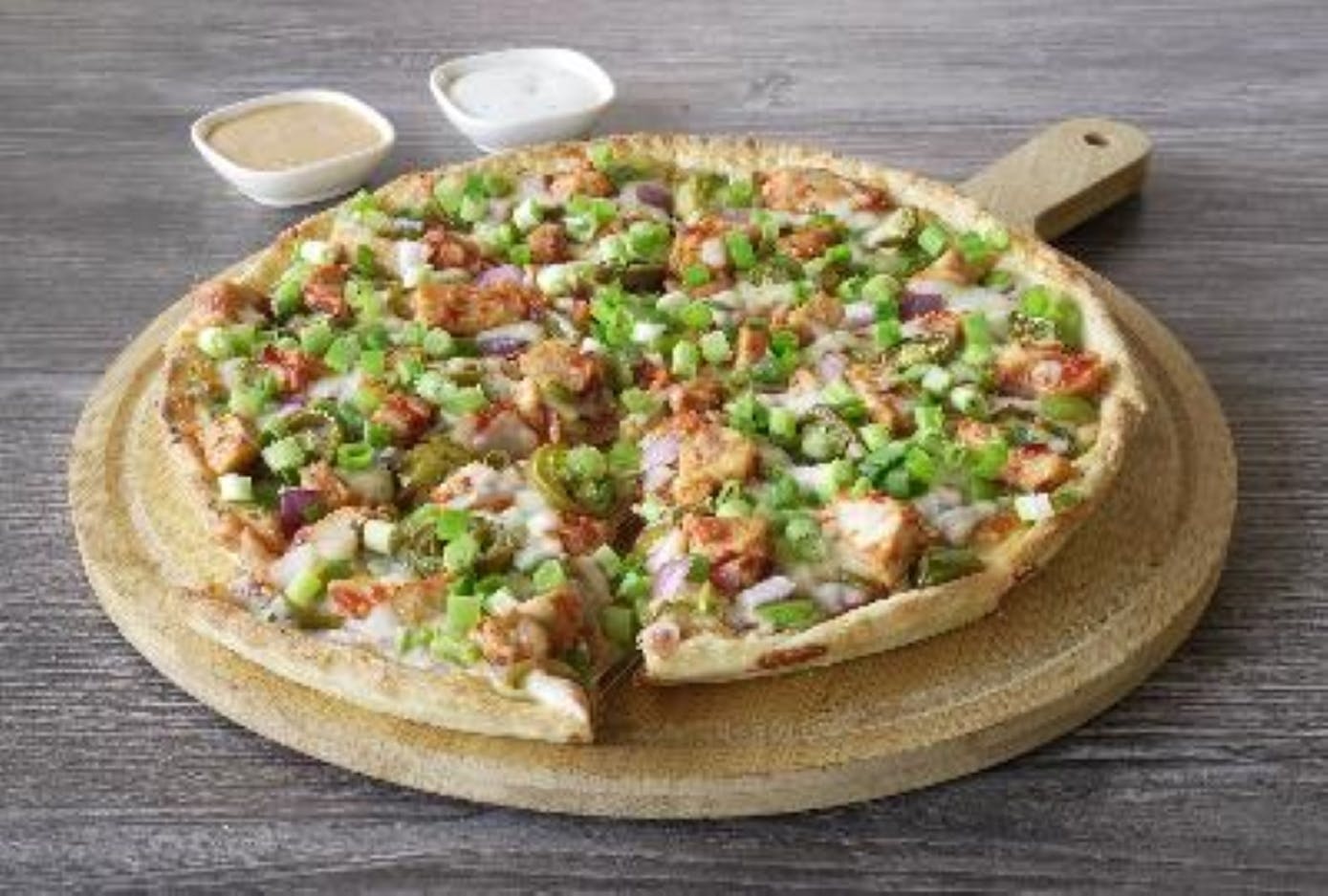 This pizza has our signature Manchurian sauce, our signature All-Natural Manchurian Chicken Breast, fresh diced mozzarella cheese, crisp red onions, crisp bell peppers, spicy jalapenos, fresh diced; garlic, ginger, and green chilies, topped with fresh cut green onions